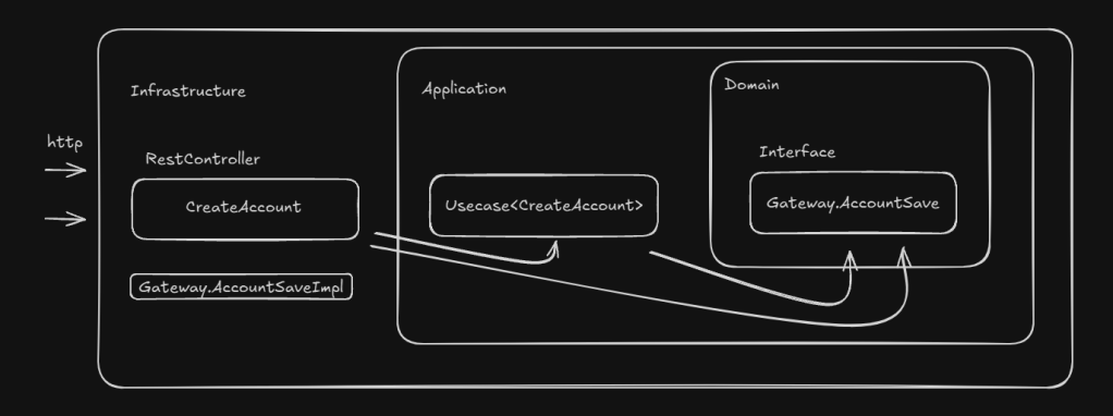 A arquitetura limpa é caracterizada por uma estrutura em camadas, onde as dependências entre as camadas são sempre de baixo para cima (das camadas externas para as internas).